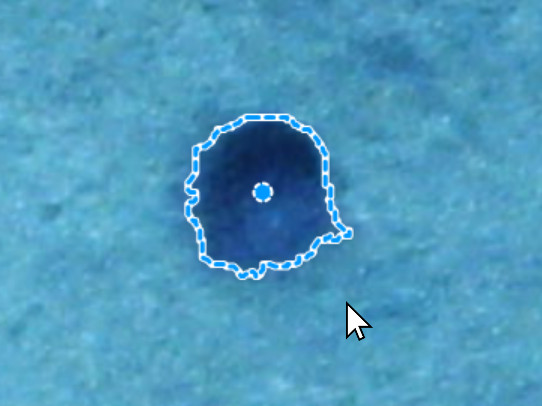 Internally, the magic wand tool uses a scanline flood fill algorithm with a variable threshold to detect a region. The flood fill algorithm starts with the pixel at the point where the mouse button was initially pressed and adds all neighboring pixels to the detected region that don't differ too much from the color of the initial pixel. The accepted difference is computed according to a specific threshold. The threshold is dynamically updated and depends on the distance of the cursor to the point where the mouse button was initially pressed. The larger the distance/threshold, the more pixels will be added to the detected region.