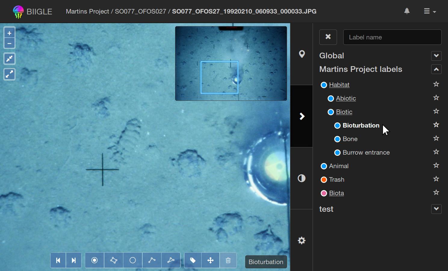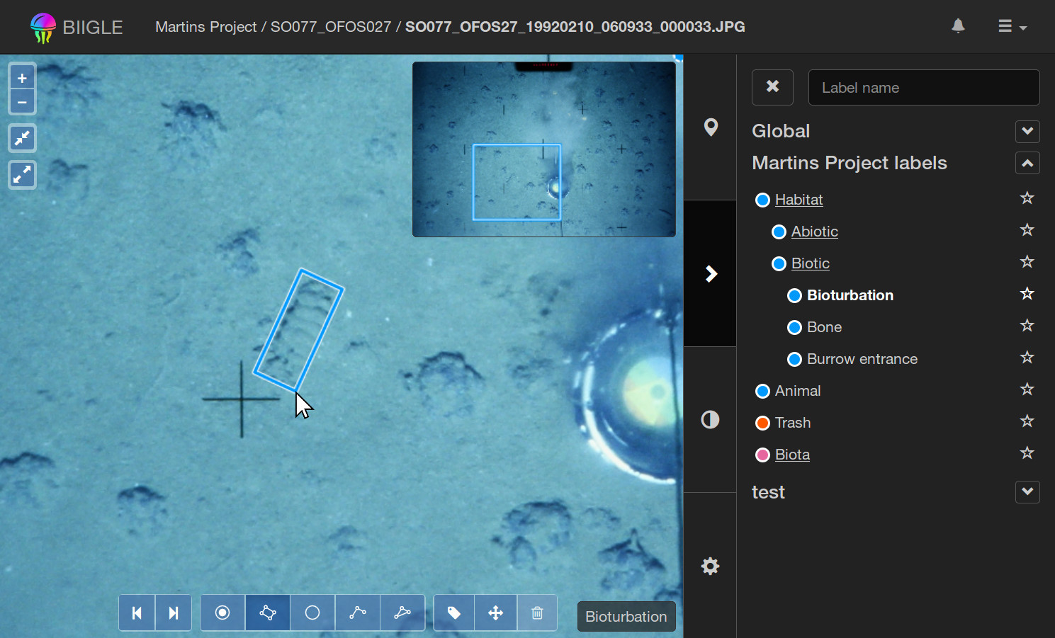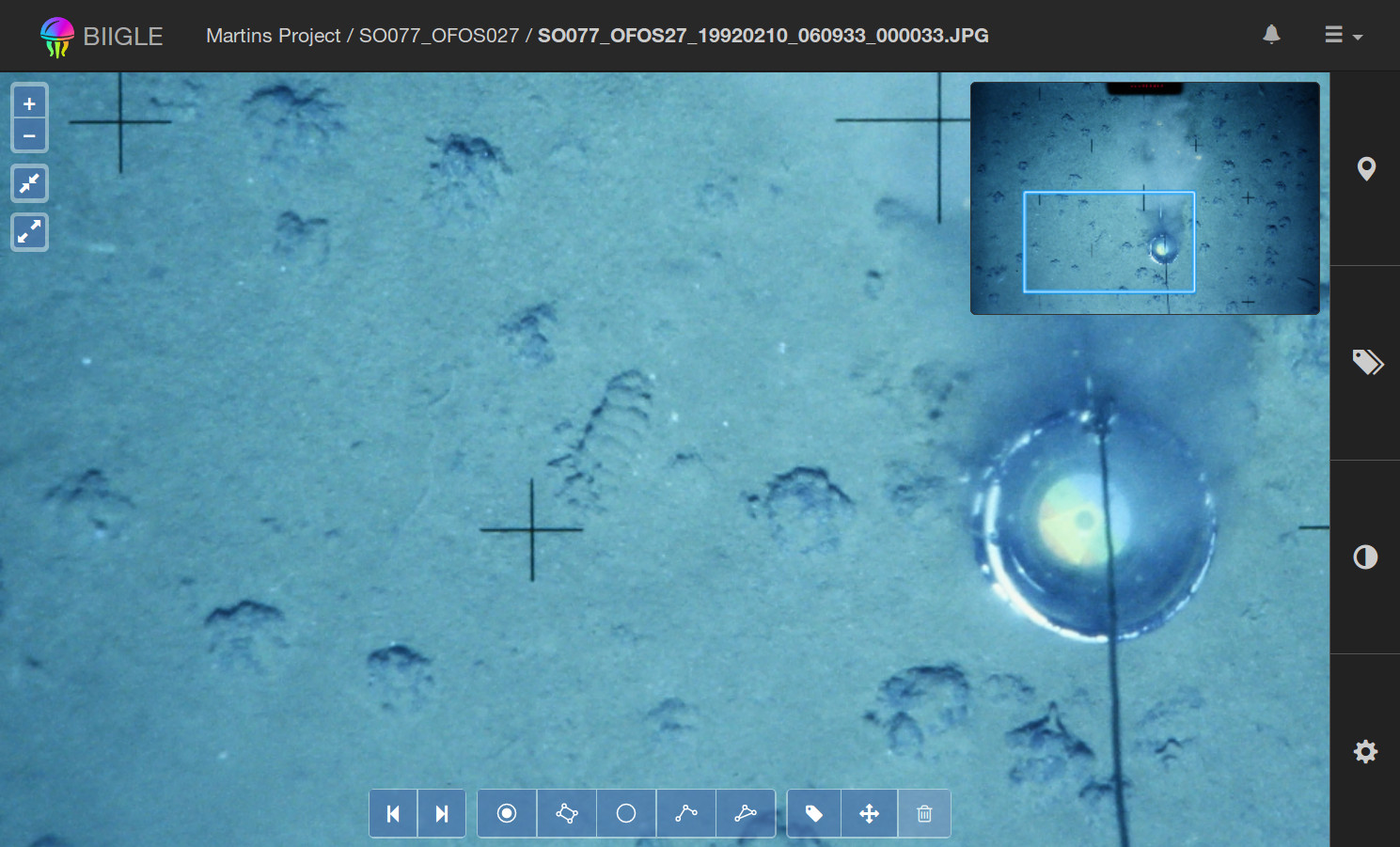 The image annotation tool can be used to navigate and explore images and their annotations. Project editors, experts or admins can also create new annotations as well as modify or delete existing ones.