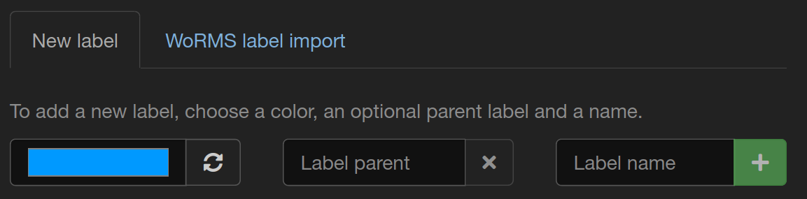 The labels of a label tree can only be modified by label tree members. New labels can be created at the right of the tab of the label tree overview. There, you find the two tabs and which are the two ways to create new labels: manually and by WoRMS import.