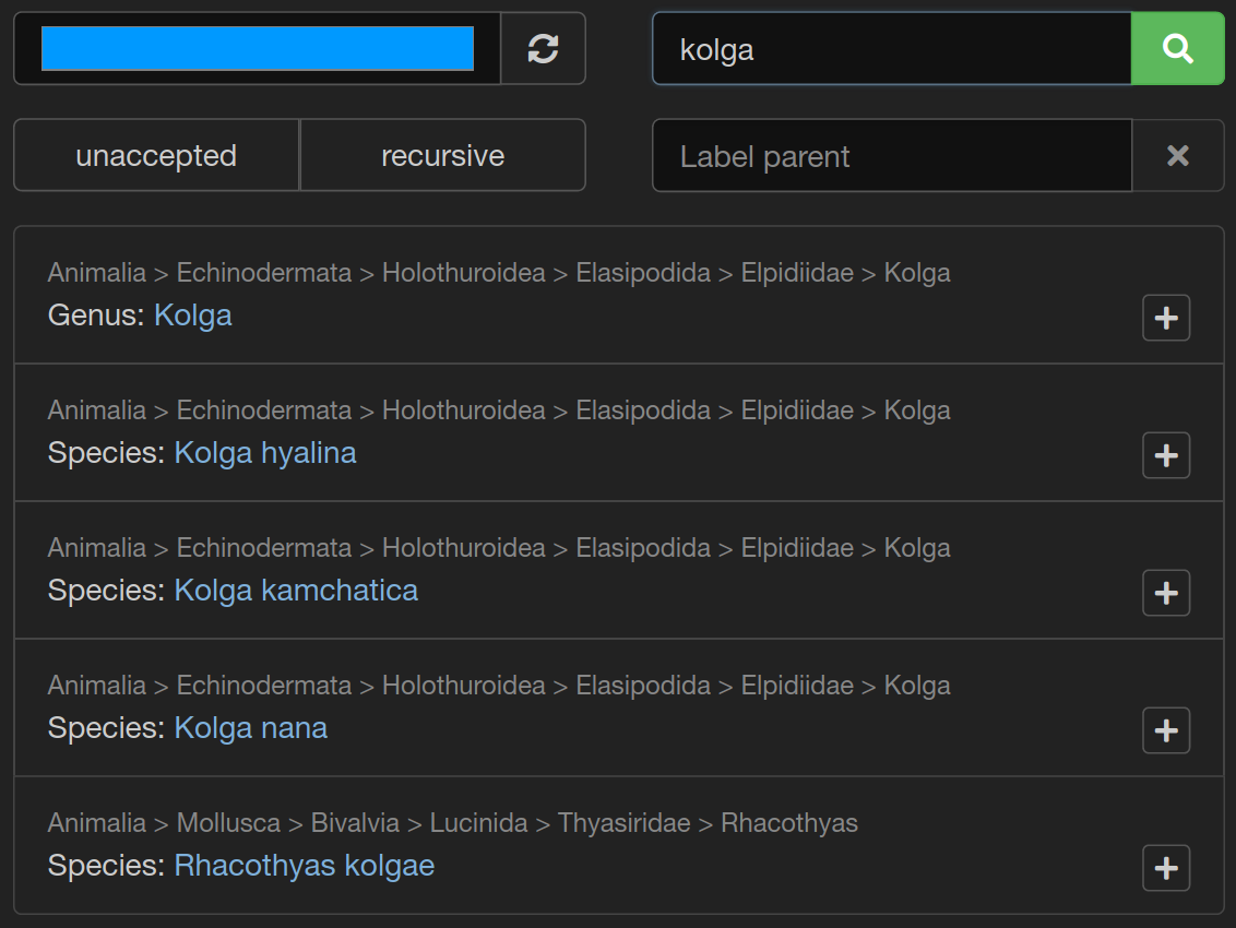 The last and most powerful option is the recursive import. This will import the found species and the whole hierarchy of parent labels from WoRMS. If you take the genus "Kolga" from the image above, for example, this would include the labels Biota, Animalia, Echinodermata, Holothuroidea, Elasipodida, Elpidiidae and Kolga! To perform a recursive import, click the button first and then the button of the species you want to import.