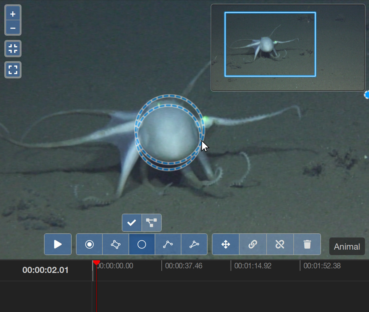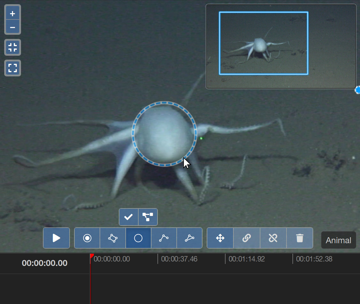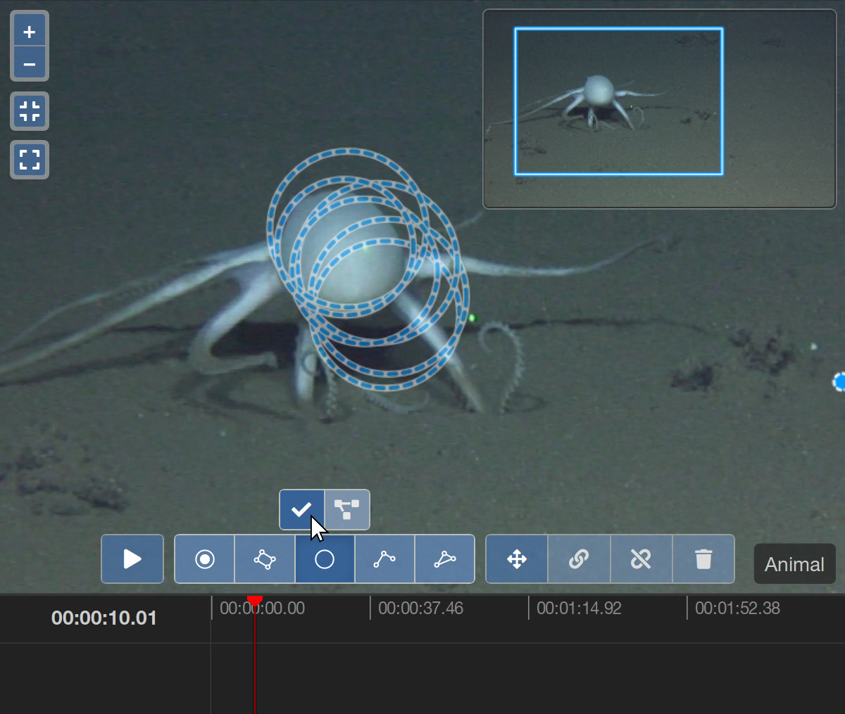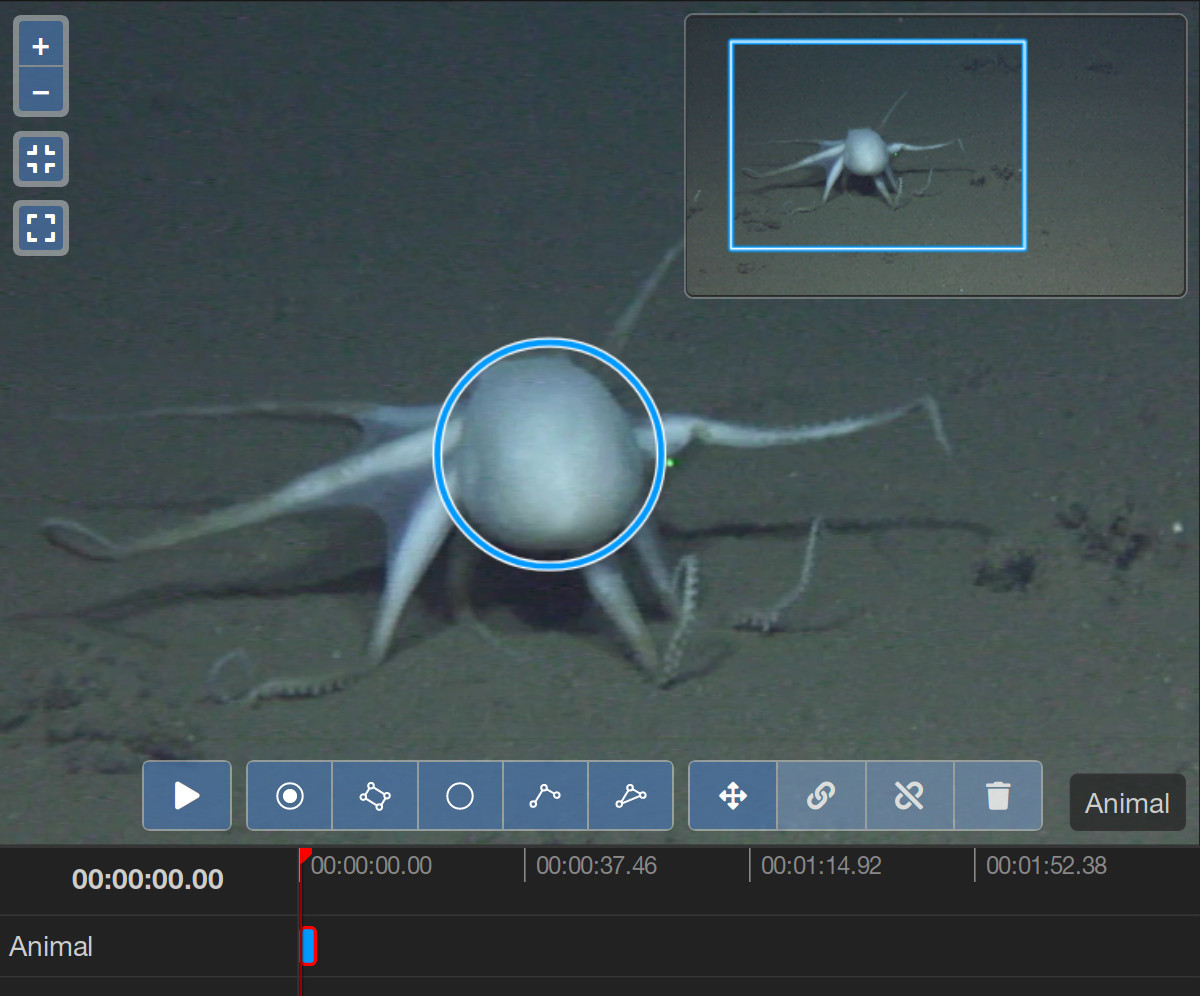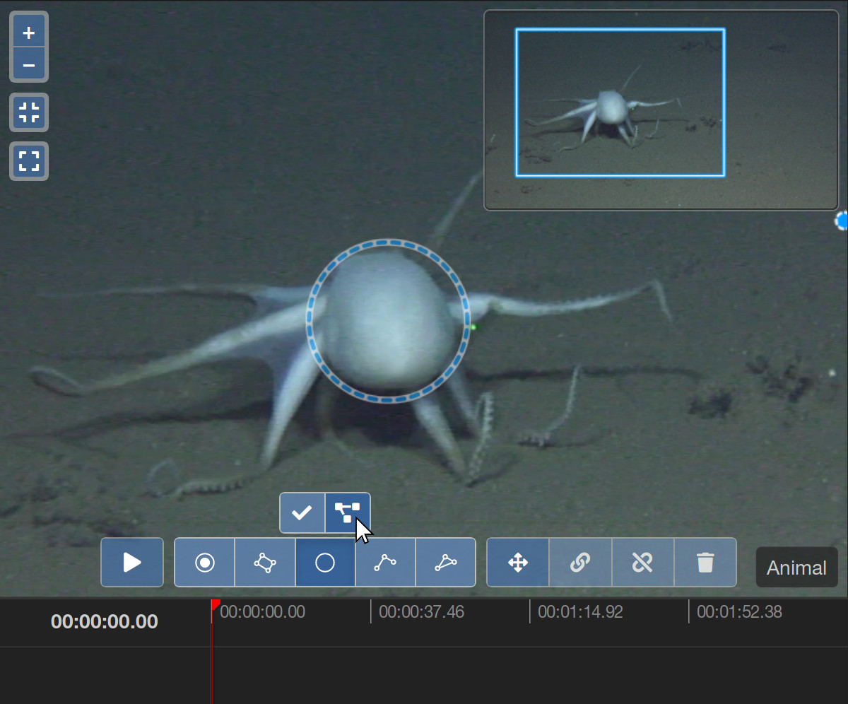 In many ways, video annotations are similar to the still image annotations that you might already be familiar with from the still image annotation tool of BIIGLE. The video annotation tool offers most of the annotation shapes that are available for still images. Learn more about these shapes in the manual article of the still image annotation tool. The ellipse shape and magic wand tool are not available for video annotations.