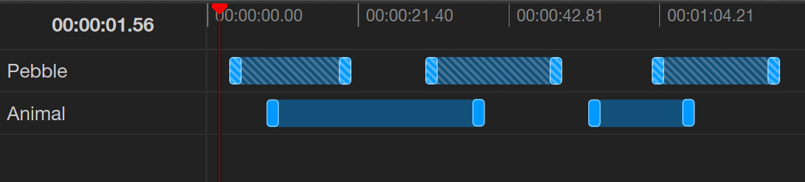 To initialize a whole frame annotation, click the button in the tool bar. The annotation is immediately initialized at the current time of the video. To create a single-keyframe whole frame annotation, click the button. To create a whole frame annotation that spans multiple video frames, play the video or select a later video time and then click the button. Whole frame annotations are only displayed in the video timeline and can be distinguished from regular annotations by their crosshatched background.