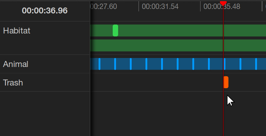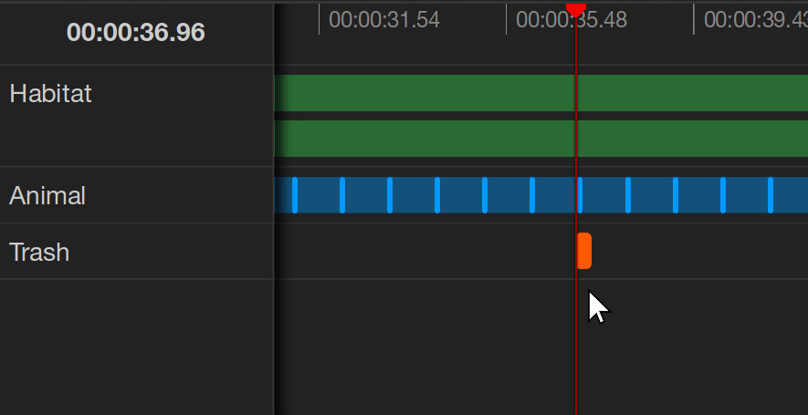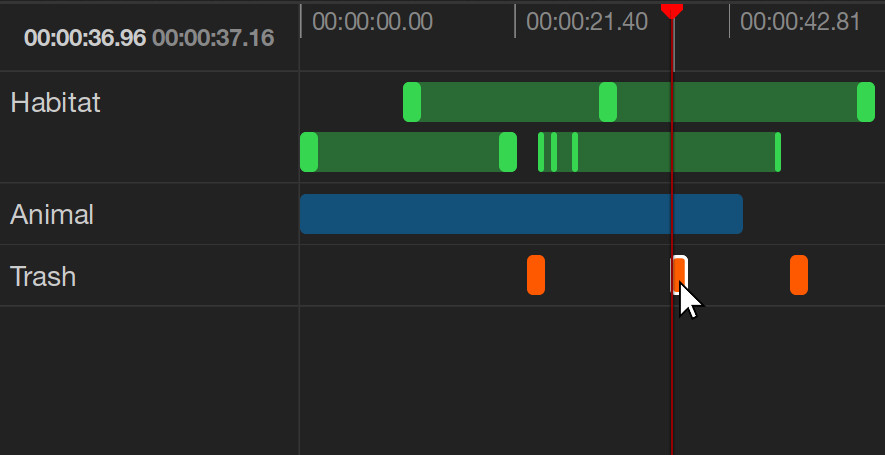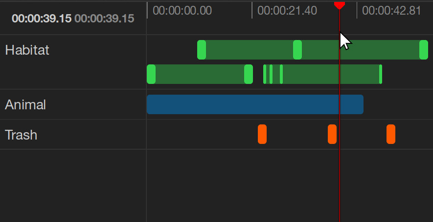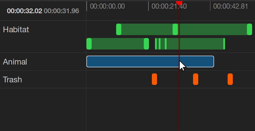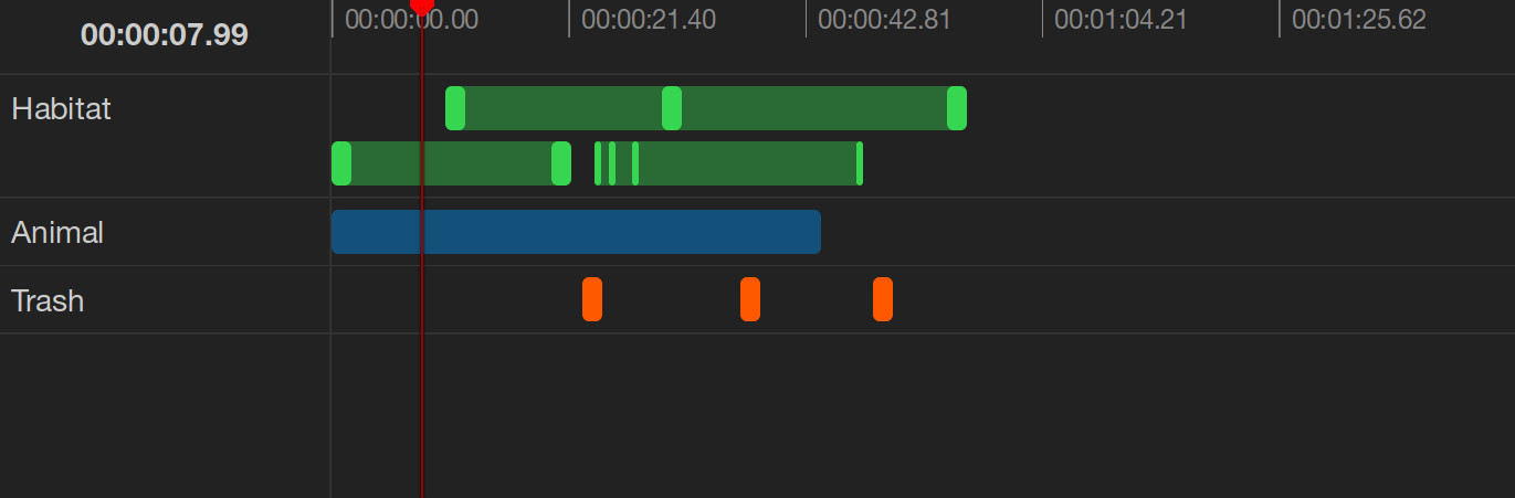 Apart from the video itself, the timeline is the second most important element of the video annotation tool. It shows at which point of time you currently are in the video and it visualizes all annotations of the video at a glance. Additionally, it is used for the more advanced ways of editing annotation clips.