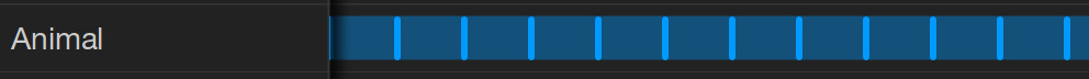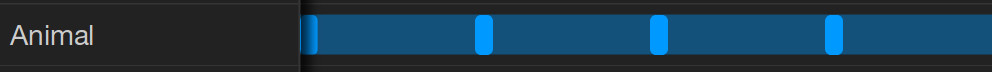 Single-keyframe annotations are displayed as single bars at the time they occur along the time axis. Annotation clips, which consist of multiple keyframes, are displayed as multiple connected bars. The first and the last keyframe determine the duration of the annotation clip. Annotation clips can be displayed in three different ways, depending on the space between two of their keyframes and the current zoom along the time axis. In the most condensed form, the keyframes of an annotation clip are invisible. In the partly condensed form, the keyframe bars are visible but smaller than in the regular form.